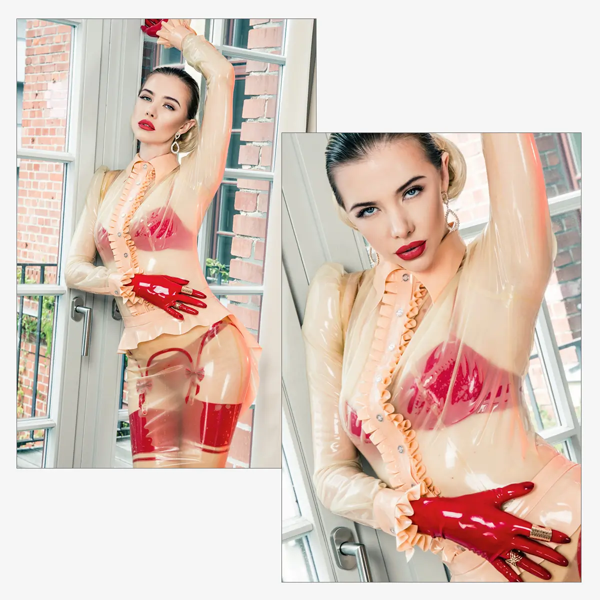 Feinstes Latex verleiht der Bluse eine fließende Silhouette, die auf den ersten Blick an luxuriöse Seidenstoffe erinnert und zugleich durch ihre moderne Ausstrahlung fasziniert. Der geschickte Schnitt sorgt für eine dezente Faltenbildung, die Bewegung ins Design bringt und der Optik eine besonders elegante Leichtigkeit verleiht. Trotz der hautnahen Passform wirkt die Bluse niemals einengend, sie sitzt anschmiegsam und komfortabel, passt sich der Körperform ideal an und unterstreicht die weibliche Linie auf raffinierte Weise.